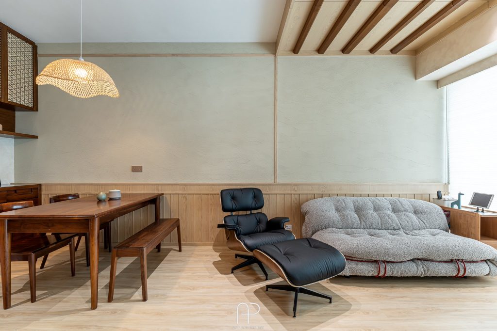 客飯廳作為家庭互動的重要空間,設計團隊於天花板上精心設計了仿日式橫樑的木條結構,提升整體空間的層次感。牆面則選用兼具美觀與實用功能的硅藻土,具備吸濕防潮效果,結合半腰圍身板的木質設計,打造出寧靜而溫馨的居家環境。